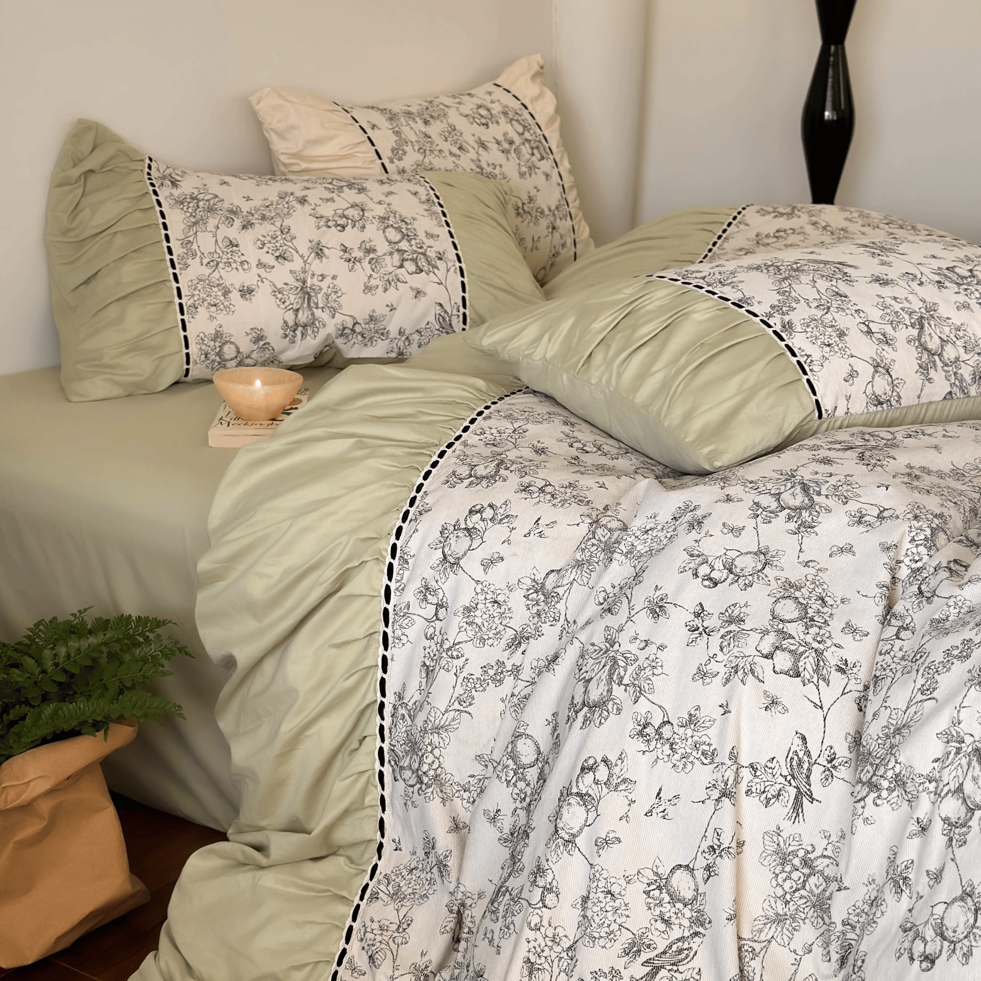 The Parisian Elegance Bow-Tie Bedding Set blends timeless romance with refined sophistication, featuring delicate floral prints, pleated ruffle accents, and charming bow details. The graceful black trim enhances the contrast and depth, giving the set a Parisian-inspired vintage aesthetic. The flowing ruffles and dainty bows add a whimsical yet luxurious touch, making this bedding set a true statement of charm and elegance.